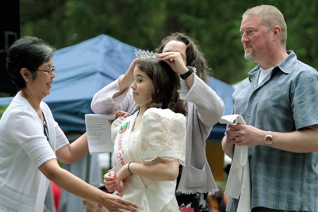 Frankie Russo reacts as she gets her queen’s crown — with the help of her mother Monica — at the coronation ceremony for the 2018 Strawberry Festival Royal Court during the annual festival Saturday at Filipino American Community Hall.