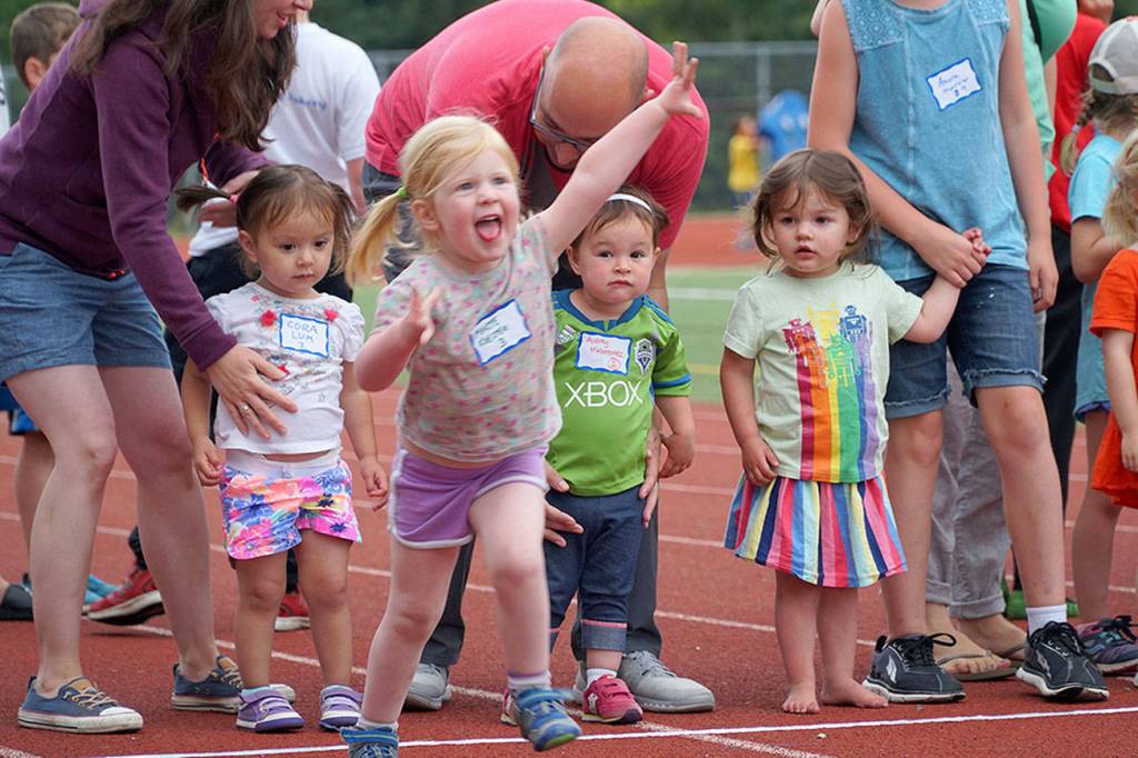 One eager sprinter leaps ahead before the “go” command is given, much to the confusion of her fellow athletes, at the season’s first Kiwanis All-Comers Track Meet at Bainbridge High School Monday.