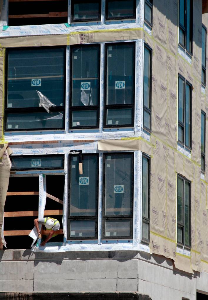 A construction worker frames windows of the Bainbridge Landing develpment, slated for completion early next year.