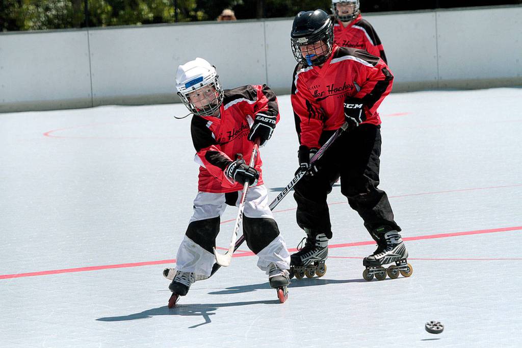 A player passes the puck during the Jets/Wild matchup in roller hockey Saturday at the Bainbridge Roller Hockey League’s rink at Battle Point Park.