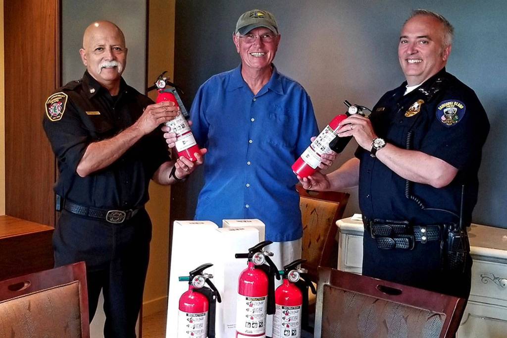 The club — whose informal motto is “Boat safely and wear a loud shirt” —actively promotes safety as a focus within the club, but also want to extend the effort to the entire island, including the boating community. The intent for the donated extinguishers is for the Bainbridge Island Police Department marine unit, when doing boat inspections, to be able to offer a fire extinguisher at no cost to boaters who are found to not have one, according to members of the Eagle Harbor Yacht Club. And the fire department can provide a free extinguisher to homeowners when doing smoke detector installations if found to not have one.