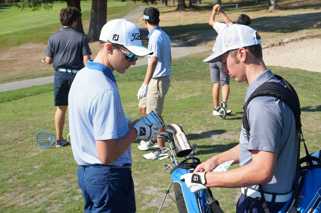 Luciano Marano | Bainbridge Island Review - Members of the Bainbridge High School boys varsity golf team exchange score cards before a practice round.