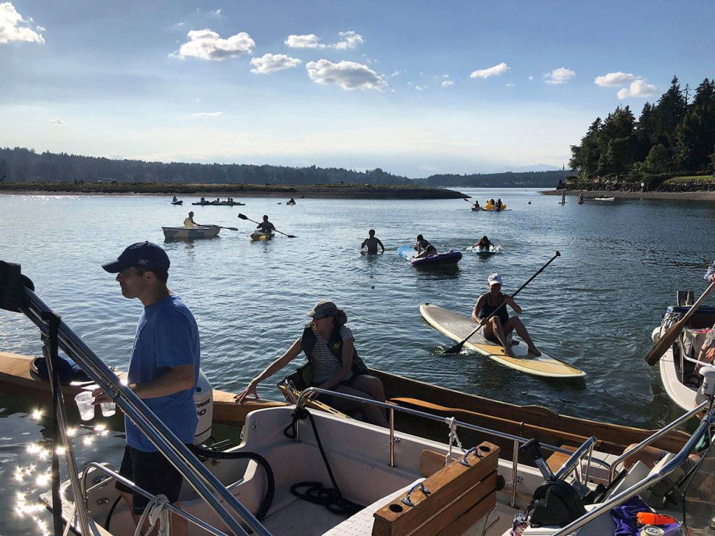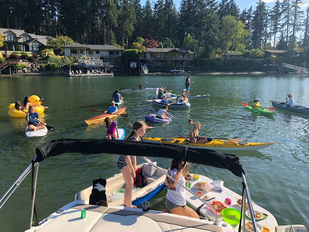 Fletcher Bay neighbors held a floating block party on Labor Day, and drew about 60 people from around the bay on every sort of boat/board/inflatable imaginable.