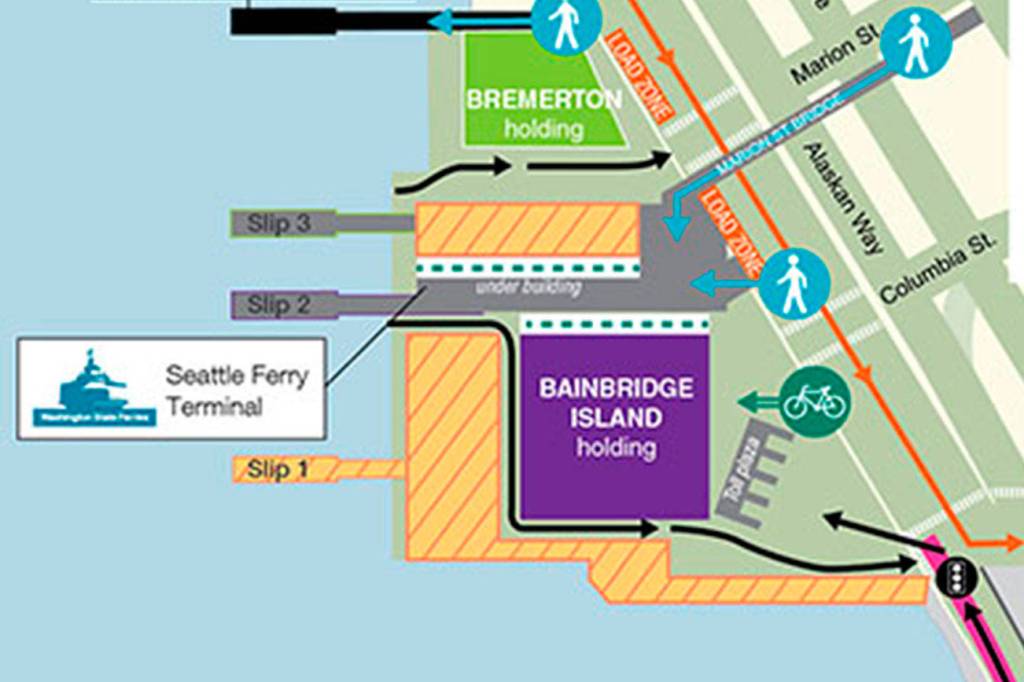 Drivers heading to Bainbridge Island from Washington State Ferries’ Colman Dock will find shrinking — and shifting — holding lanes at the ferry terminal.