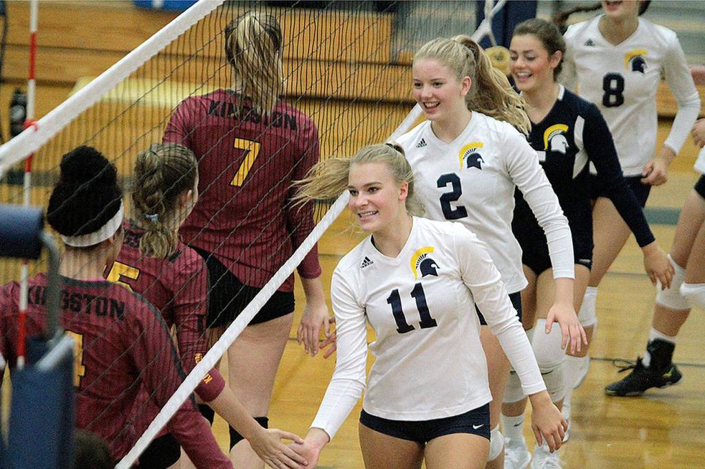 The Bainbridge Spartans girls varsity volleyball team, led by players Paige Bouma and Ava Targett, shares low fives under the net with the visitors from Kingston before the start of the BHS-Kingston matchup Friday in Paski Gymnasium.