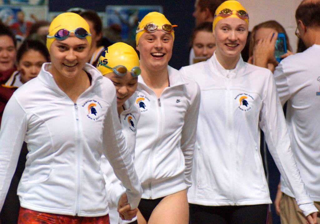 A quick moment of silence followed the end of the race as all eyes turned to the scoreboard to see who had won. And the Spartans swimmers found out they were the champs when Bainbridge’s huge cheering section erupted in the stands.