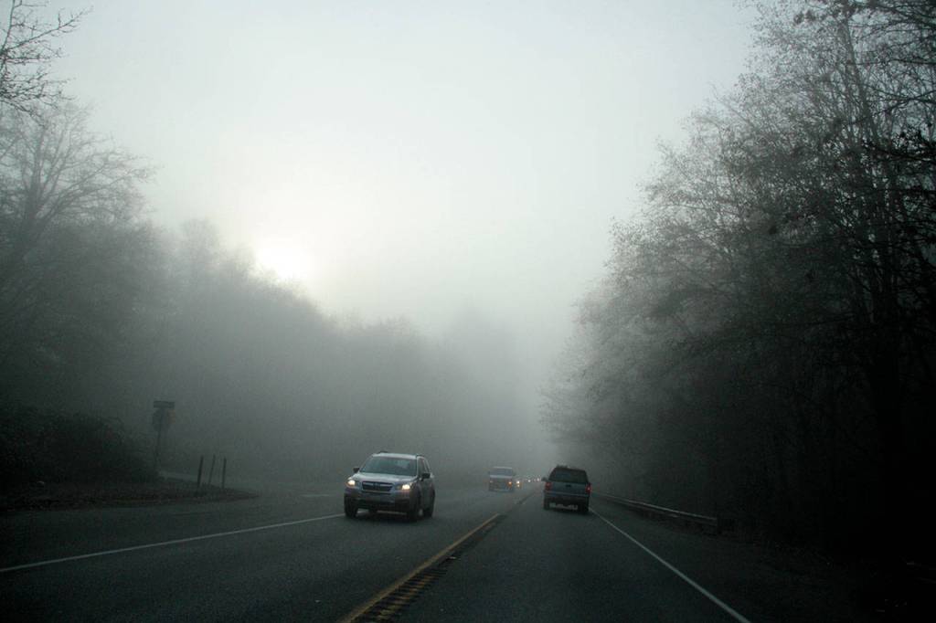 Drivers on Highway 305 motor through foggy morning weather earlier this week on Bainbridge Island. (Brian Kelly | Bainbridge Island Review)
