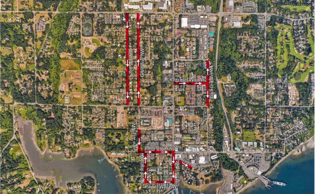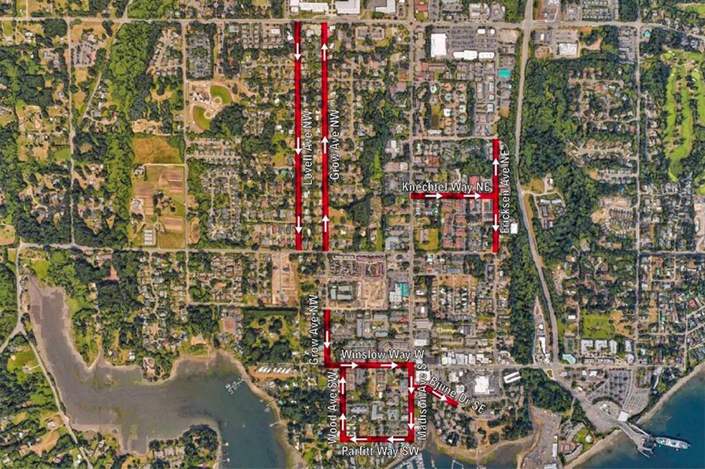 Traffic would be limited to southbound only on Madison Way, then west only on Parfitt Way Southwest, then north only on Wood Avenue Southwest. Winslow Way between Wood Avenue and Madison would be an eastbound one-way.