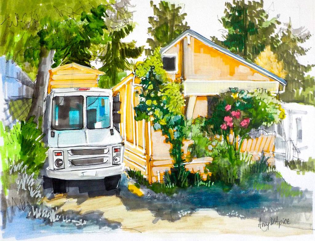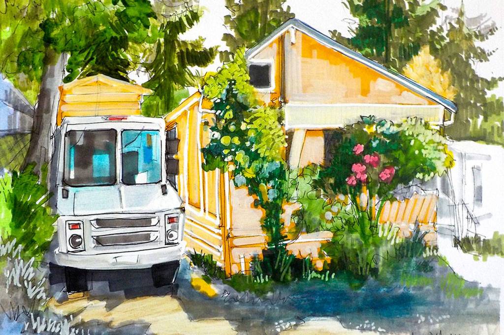 “I sketch all the time, I draw all the time and I love to work out in the world,” she said. “I was down in Fort Ward and there was this beautiful little white cabin, waterfront property [with a] little white cabin — somebody’s dream house, little dollhouse with the weeping willow tree — and up at the top of the driveway was a cluster of mailboxes and a For Sale sign.