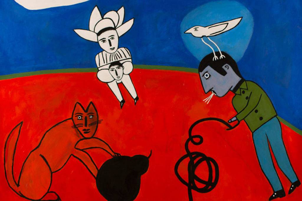 In “The Long Way Home,” BIMA presents Joe Max Emminger’s first solo art museum exhibition. Emminger, a self-taught artist, takes a spontaneous and straightforward approach to painting. His work is typically colorful, bold, and whimsical — yet darker narratives also emerge.