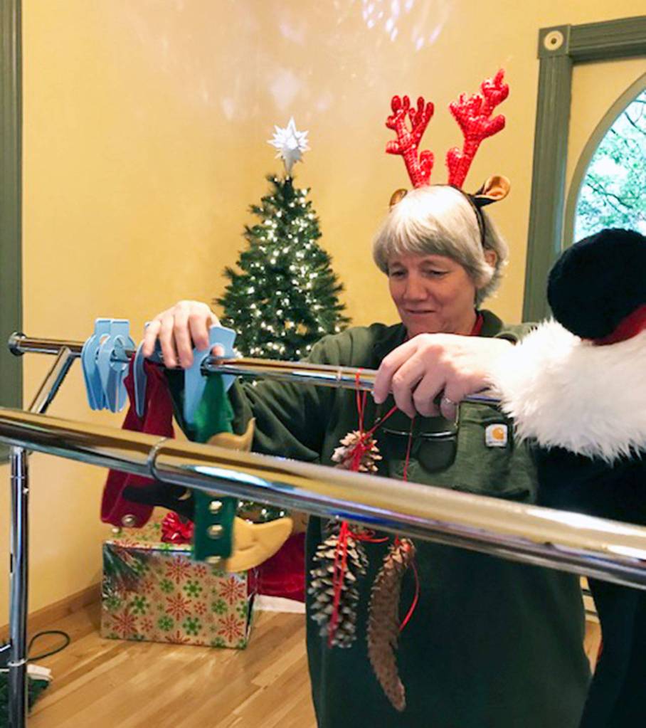 The Rev. Cindy Roberts gets into the holiday mood as she helps set up for the churchs annual holiday bazaar, planned this year for Saturday, Nov. 9. (Photo courtesy of Seabold Methodist Church)