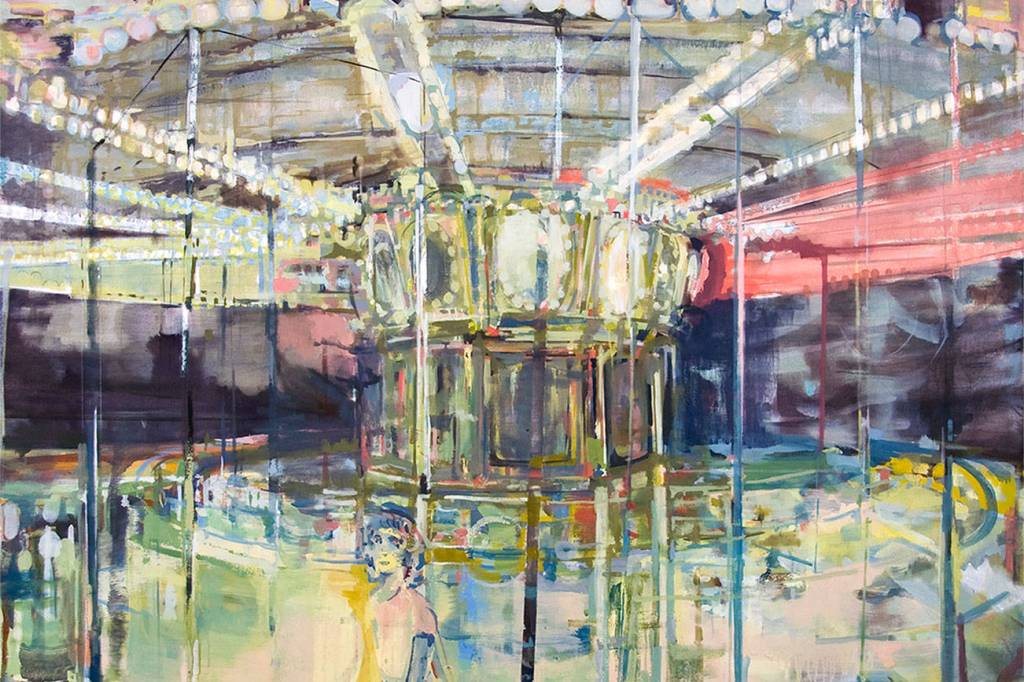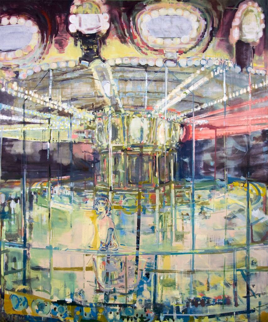 Two large canvases dominate the exhibit; both are in oil paints and depict narrative scenes of unnerving, layered, and ambiguous beauty. Strong composition and structure ground the viewer, while fluid painterly marks and color relations create a highly dynamic surface. Imagery of architecture and young girls are present in both.