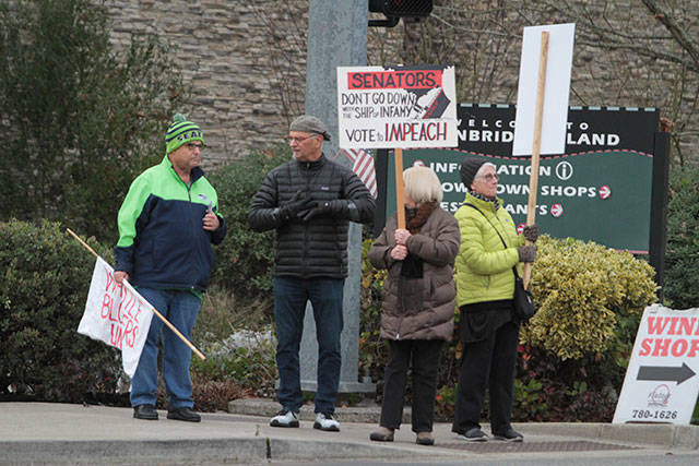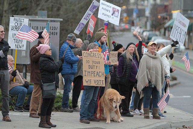 Protesters packed Bainbridge Island’s main downtown intersection Tuesday to call for the impeachment of President Donald Trump on the eve of the historic vote in the U.S. House of Representatives on two articles of impeachment.