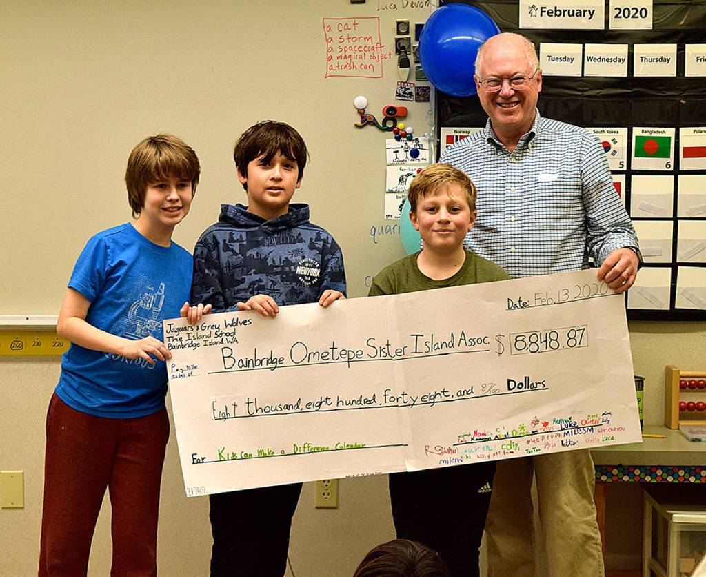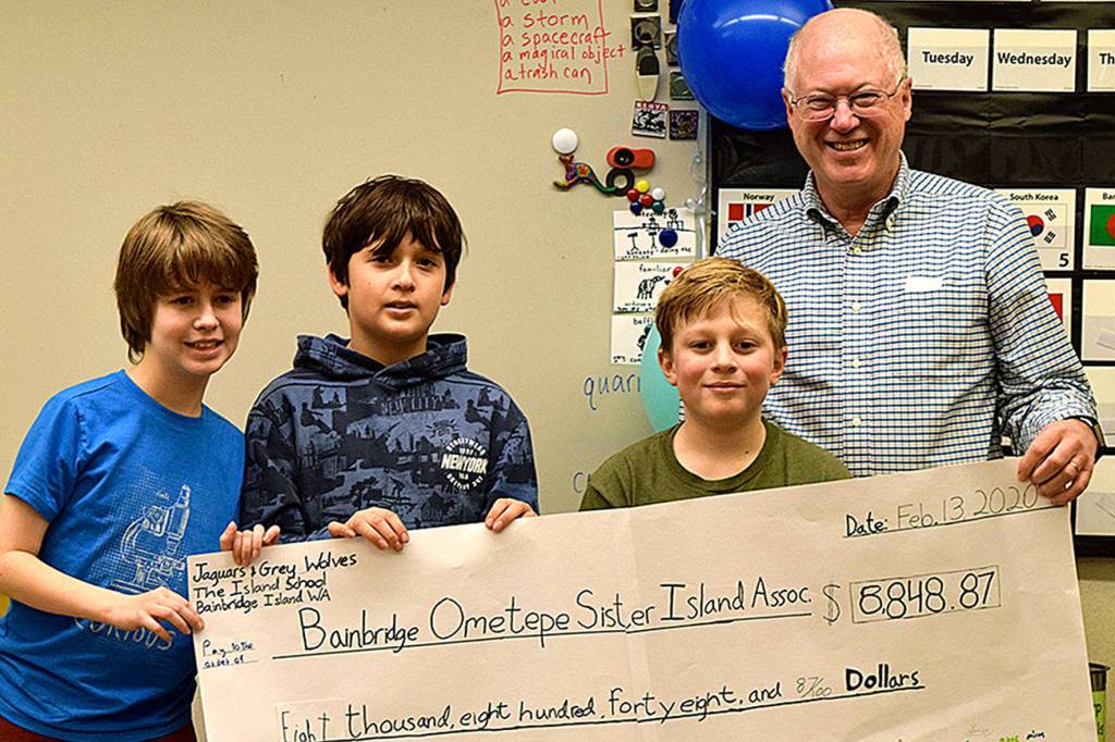 The students presented a check from the fundraiser last week to Bainbridge Ometepe Sister Islands Association (BOSIA) treasurer Paul Carroll.