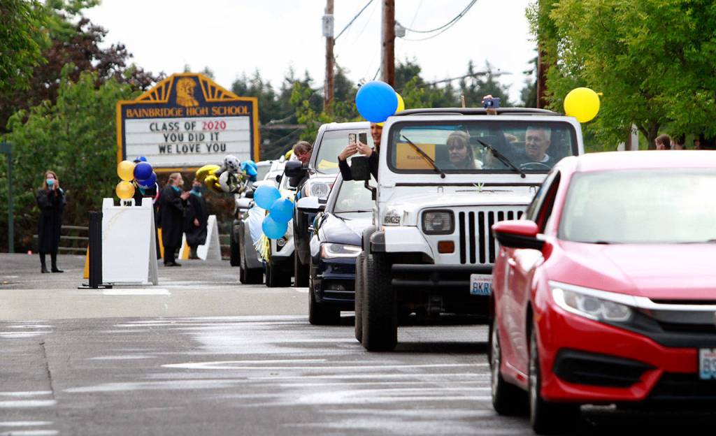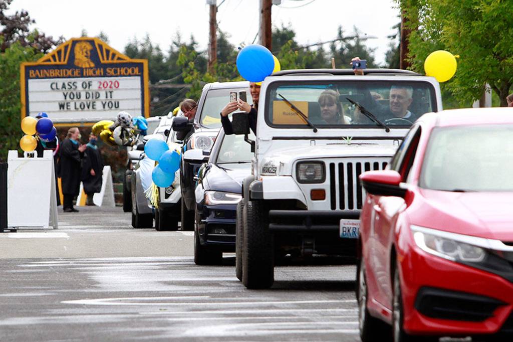 A drive-thru commencement ceremony may not have been the finale they’d spent four years envisioning, but the graduating seniors of the Class of 2020, with the help of their family, teachers and friends, eagerly bedecked the front of Bainbridge High School and their respective cars with festive adornments and made the best of things Saturday.