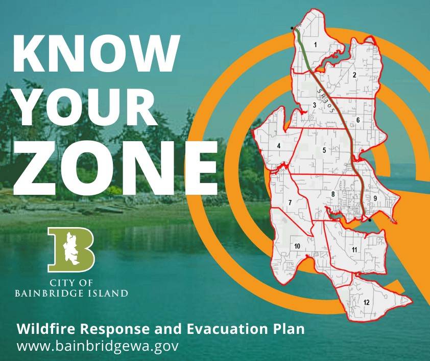 Bainbridge Island is divided into 12 evacuation zones; making it important for every resident to “Know Your Zone”. Please see the city’s Wildfire Response webpage to learn more.