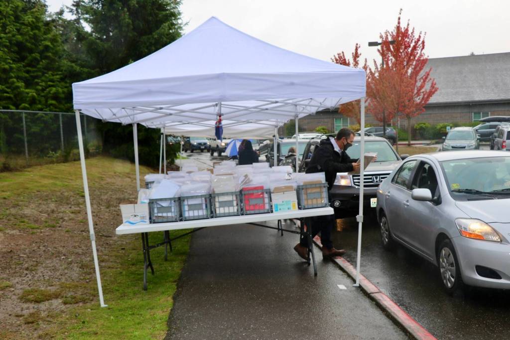 Principal Drew Crandall and other school staff, braved the rain to direct traffic and make sure families got what they needed.