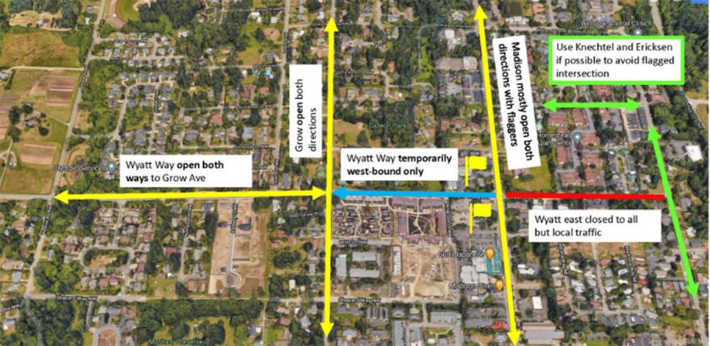 - Traffic along Wyatt Way NW will be open in both directions, but eastbound traffic will face a detour at Grow Avenue to allow a single lane closure on Wyatt Way NW between Madison Avenue and Grow Avenue for trucks, equipment and staging of materials.