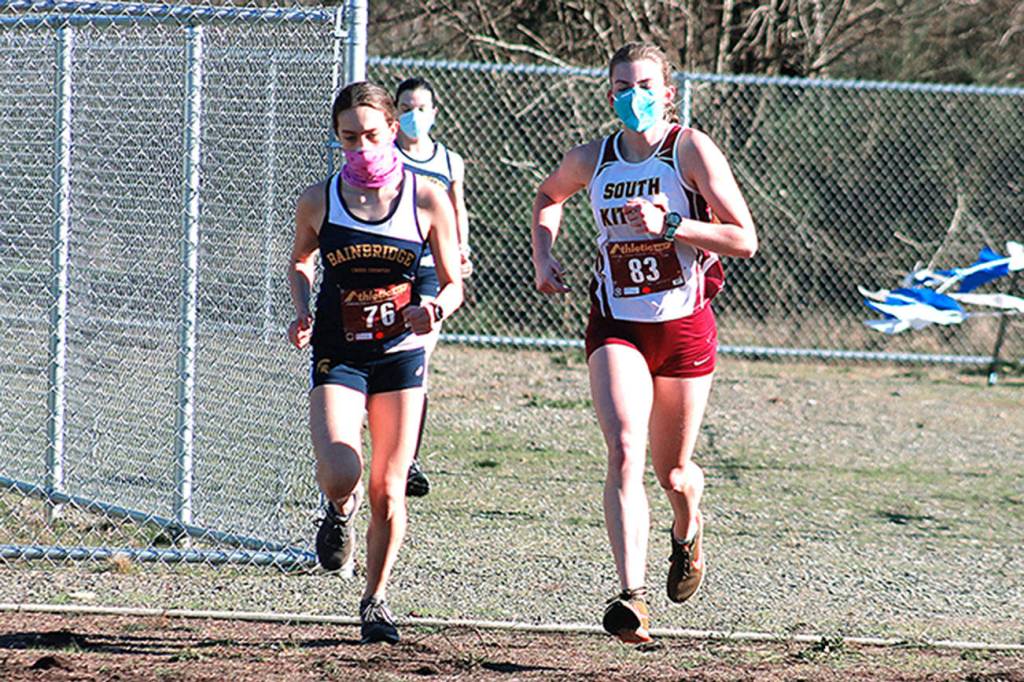 The Bainbridge girls defeated South Kitsap 23-34 as Spartans runners finished second, third, fourth, sixth and eighth. Lucy King came in third after Michael with a time of 13:44.09, followed by Lily Curtis (13:54.26), Zoe Lim (14:26.08) and Liliana Pohl (15:36.84).