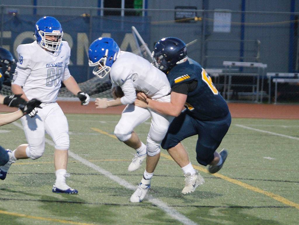 Feistner then opened the second half with an 87-yard kickoff return for a touchdown. It looked like the game could be a repeat of the previous week against Sequim, which dominated the line of scrimmage with a power running game. But the defense stiffened, allowing few big gains and first downs. The front seven was able to overcome Olympic’s talented offensive line.