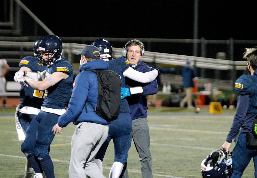 After one final stop on defense, Bainbridge was in victory formation. That unit had recovered from yielding 21 points in the second quarter and, led by big plays from Axel Gibson, Sasha Herrmann, Brian Taylor, Micah Bryant and Matt LeDorze, held the Trojans scoreless in the second half.