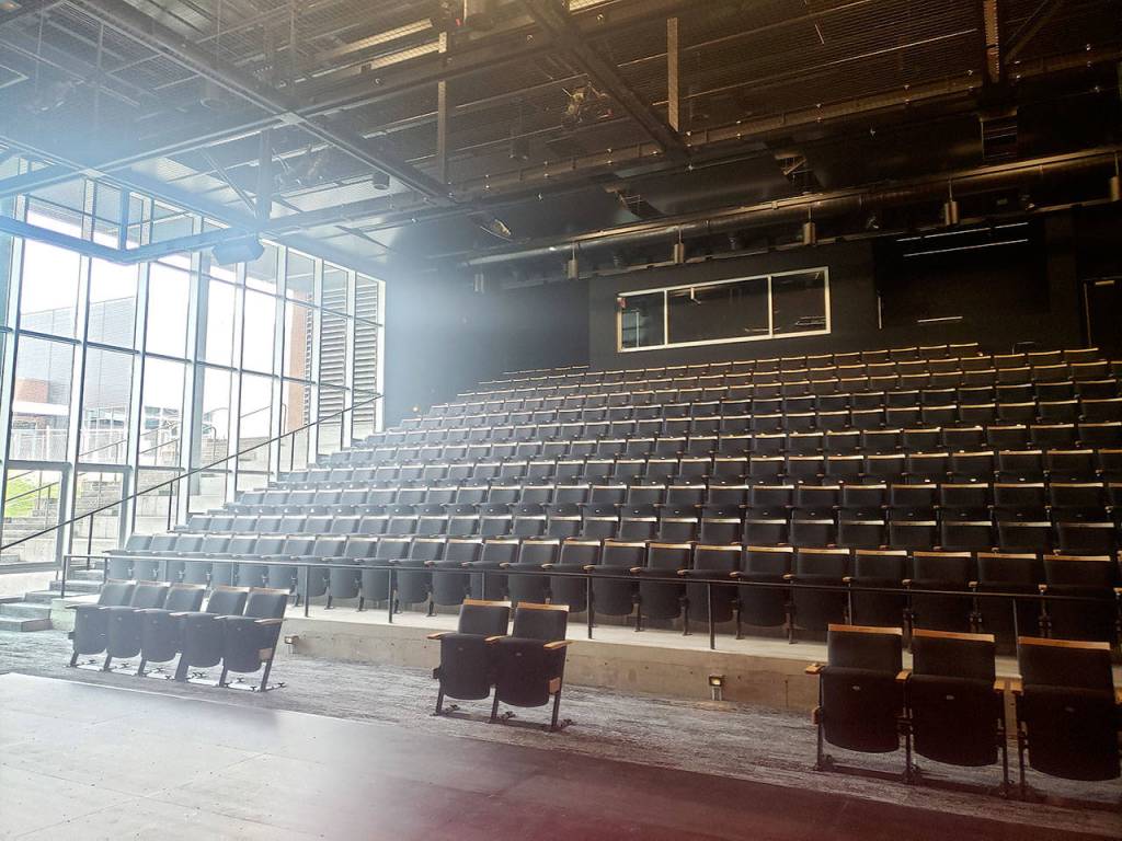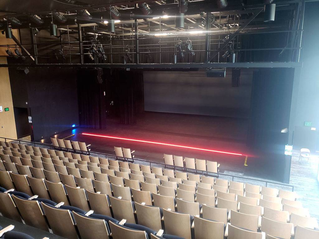 The newly equipped sound booth is located behind the seats and a tension grid is above the stage, which was designed to be walked on, hang lights and set decorations.