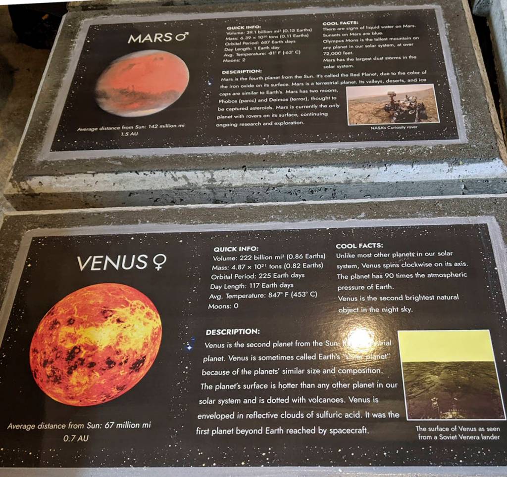 The project is a solar walk. There are 10 signs installed around the trail depicting the solar system. Each planet’s distance from the first sign is proportional to its average distance from the sun.