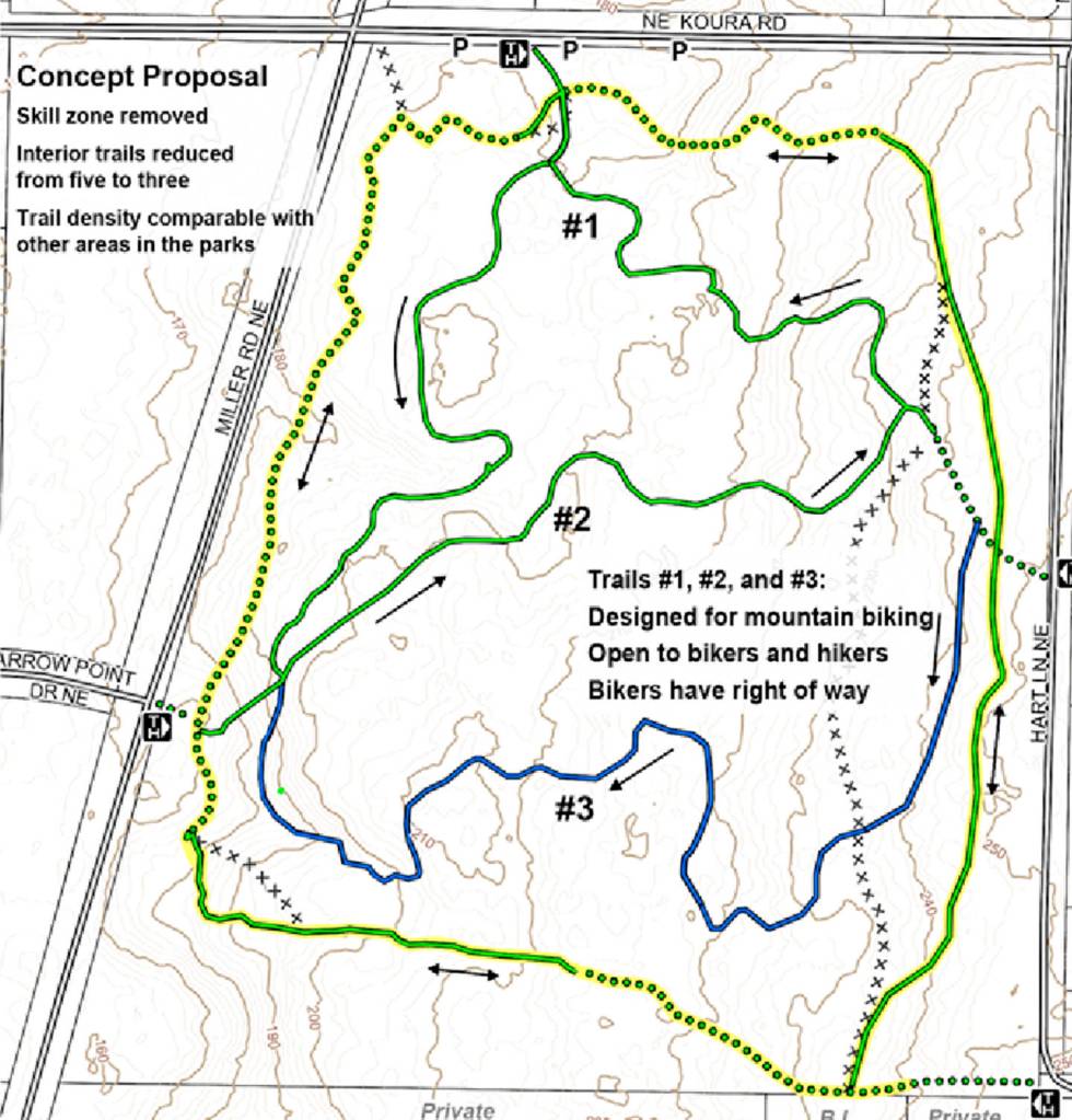 The Bainbridge Island Mountain Bike Club deleted its “Skills Zone” from the proposal where aggressive jumps and obstacles would have been. It also reduced the number of trails from five to three, which now total .84 miles.