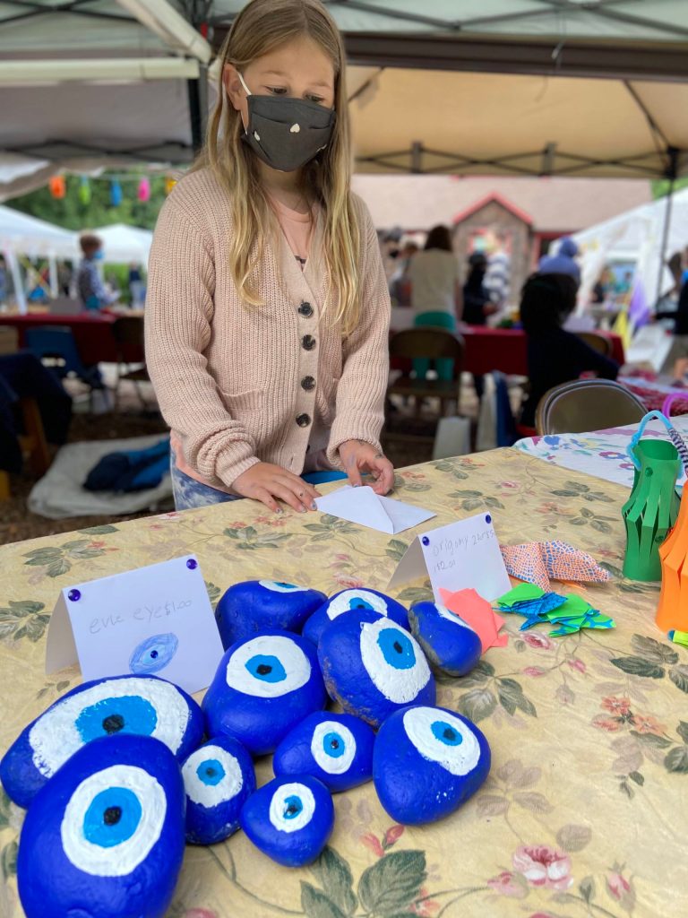 At the market, Liviana Lannon Eatinger, 8, sold paper lanterns and handmade trading cards; Kavi Danielson, 9, made cards featuring sea turtles, mosques, palm trees and camels of Oman; Scottie Carver, 9, made hand-painted evil eyes, origami animals and paper lanterns; and Chris Butterly, 8, and Billy Baxter, 8, sold Omani flag bookmarks and paperweights.