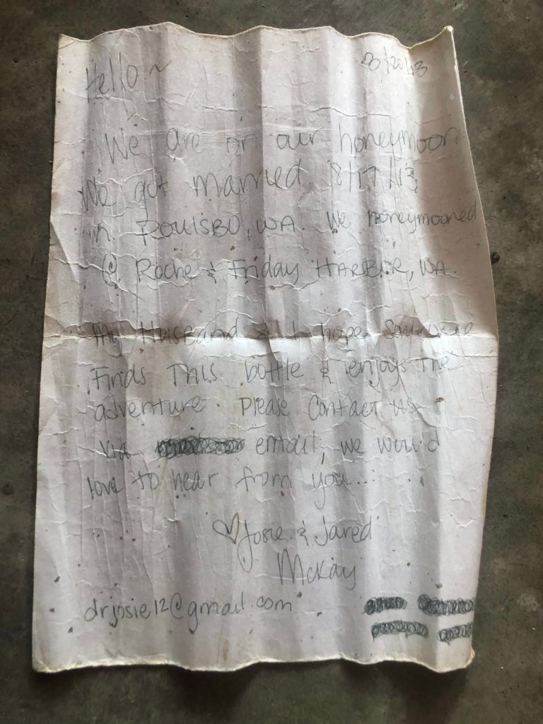 The original note appears to have been written by Josie McKay. It reads: “We are on our honeymoon. We got married on Aug. 17, 2013, in Poulsbo, WA. We honeymooned at Roche and Friday Harbor, WA. My husband and I hope someone else finds this bottle and enjoys the adventure. Please contact us via email, we would love to hear from you!”