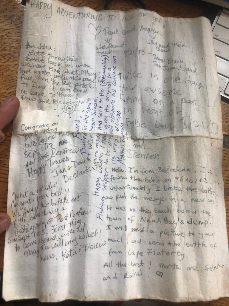 “It was put in the water in what I believe was the Roche Harbor in the San Juan Islands in 2013 by a couple who were married in Poulsbo. Before I picked it up, there were like five other people who had picked it up and added to the message. Most of them were folks on fishing boats, but one was from someone at Neah Bay,” Rannala said