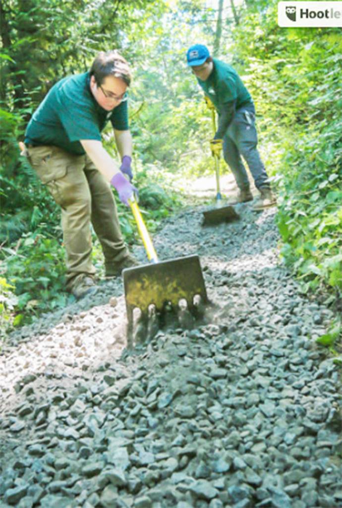 Benjamin Logan uses a rake to level out rocks on a trail.