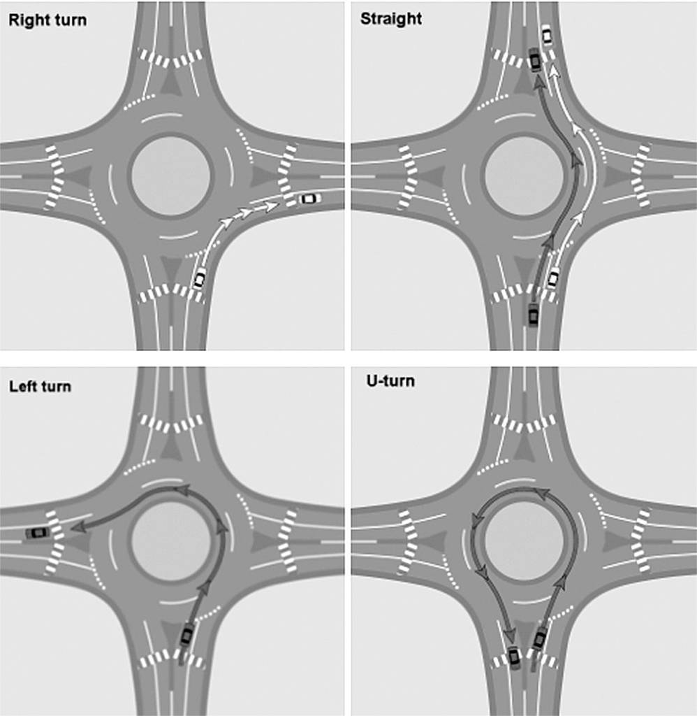 As you approach a multi-lane roundabout, you will see two signs: The yellow “roundabout ahead” sign and a black-and-white “lane choice” sign. You will need to choose a lane prior to entering the roundabout. To go straight or right, get in the right lane. To go straight or left, get in the left lane. Drivers can also make U-turns from the left lane.