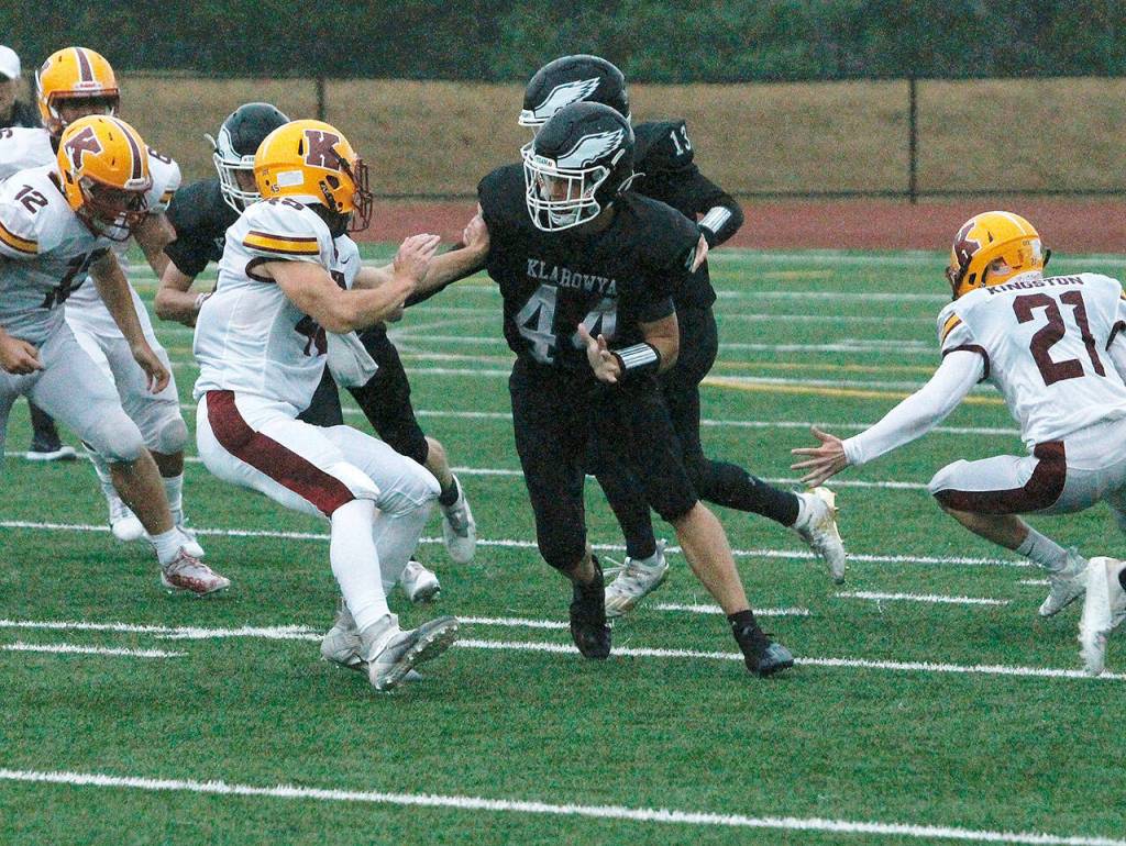 Kingston led 20-6 heading into the fourth quarter on a pair of touchdown runs from quarterback Brooks Arnim and an interception return by Hugo Hall, but Klahowya marched back into the game. Quarterback Damon Clarke connected on a deep pass with Carson Moore for a 60-yard touchdown, and Logan Wallis added a rushing touchdown to give the Eagles a 21-20 lead. Kingston answered with a 3-yard touchdown from Sam Reber, and nearly had the game in hand after forcing the Eagles to fumble on their final drive before fumbling it back to allow the winning score.