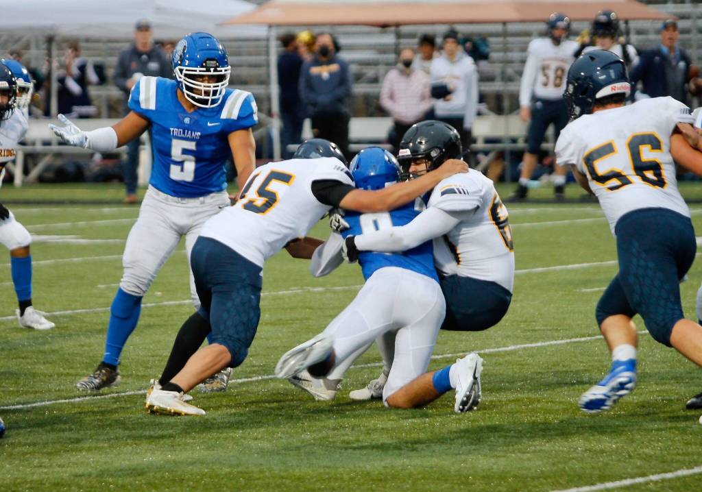 Later in the first, another bad snap on a punt gave the Trojans good field positions at Bainbridge’s 2-yard line, and Olympic took advantage as Kamano Ruis punched it home from 2 yards out to extend their lead to 14-0.