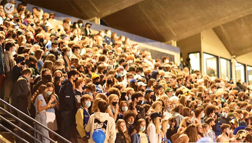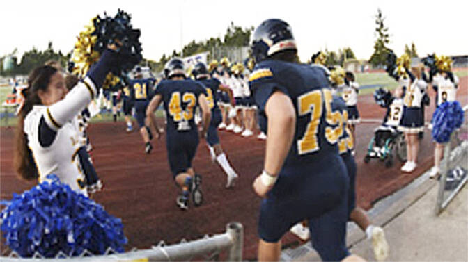 As always, Homecoming at Bainbridge High School was filled with its normal pomp and circumstance. At left, cheerleaders wave their pompoms and BHS Spartan gridders take the field. While the start of the game was filled with positive emotions, it wasn’t that way at the end of the contest as the home team was blanked by visiting Bremerton. Below, a large student section turned out for the game against Bremerton.