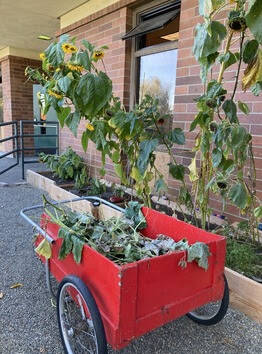 The class revitalized the garden area next to the 300 Building last spring. Work included making raised beds, planting seeds, watering and weeding. Student volunteers continued taking care of the garden over the summer.