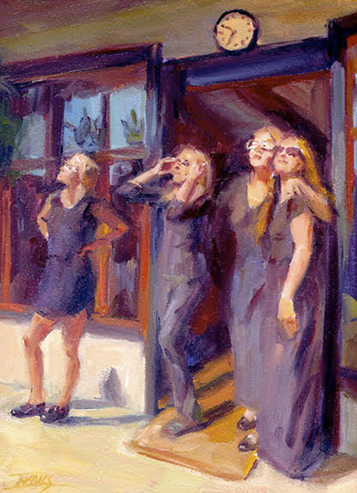 Another 12 by 9 oil on panel piece called “Sol Explorers” in the show was done by Pam Ingalls.