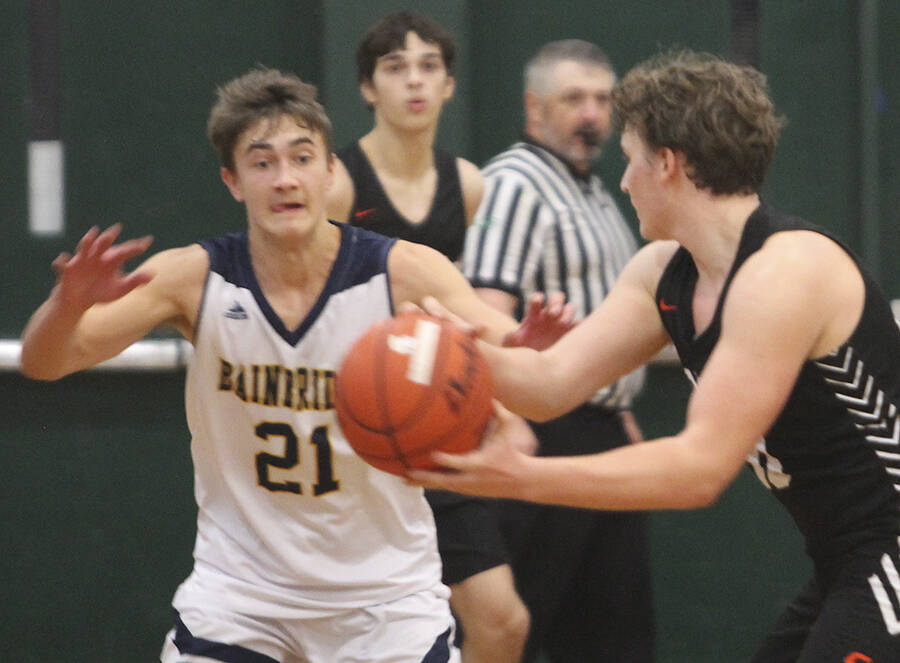Everett Moore (21) of Bainbridge plays defense against North Kitsap.