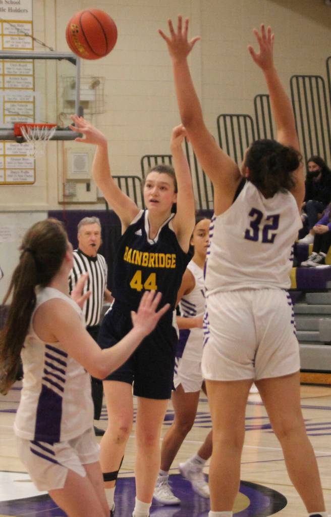Maia Greiwe of Bainbridge (44) passes the ball between two North Kitsap defenders.