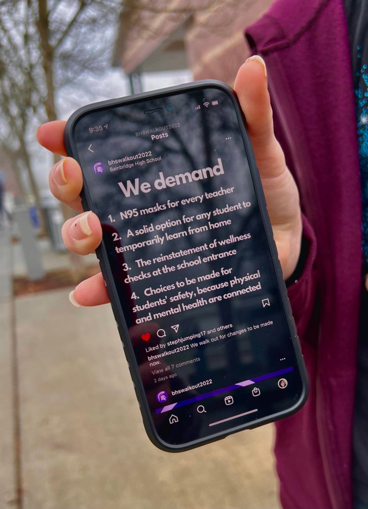 A student from Eagle Harbor High School was protesting in silence and typed responses on a cellphone. The student was concerned about the transparency of reporting COVID contacts and doesn’t feel safe at school because she had been exposed to a COVID-positive person on Jan. 10 but did not know in which class it occurred. She would prefer remote learning at home.