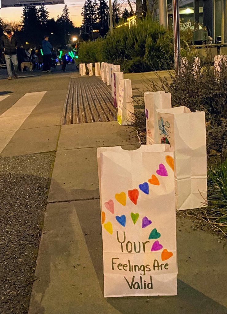 The unseasonably good weather kept the outdoor event dry for the white paper bags that illuminated messages of hope, love and encouragement for those struggling with mental health challenges during the pandemic.