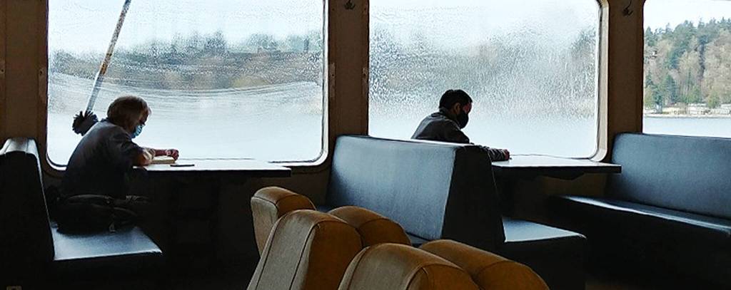 A ferry rider from Seattle to Bainbridge looks like he’s getting his back scratched. Actually, ferry workers from the deck above are washing and rinsing the windows.
