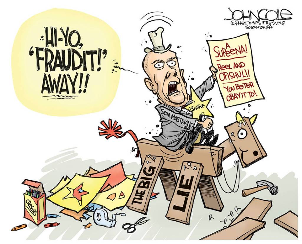 Mastriano insisted that Dear Leader had been “cheated” out of his victory by a “corrupt” election process – “There is mounting evidence that the PA presidential election was compromised” (there was no such evidence) – and therefore “we are going to take our power back.” When all that failed, he bused supporters to the Capitol insurrection on Jan. 6. And when that failed, he wasted time in 2021 agitating in vain for an “audit” of the Pennsylvania election.