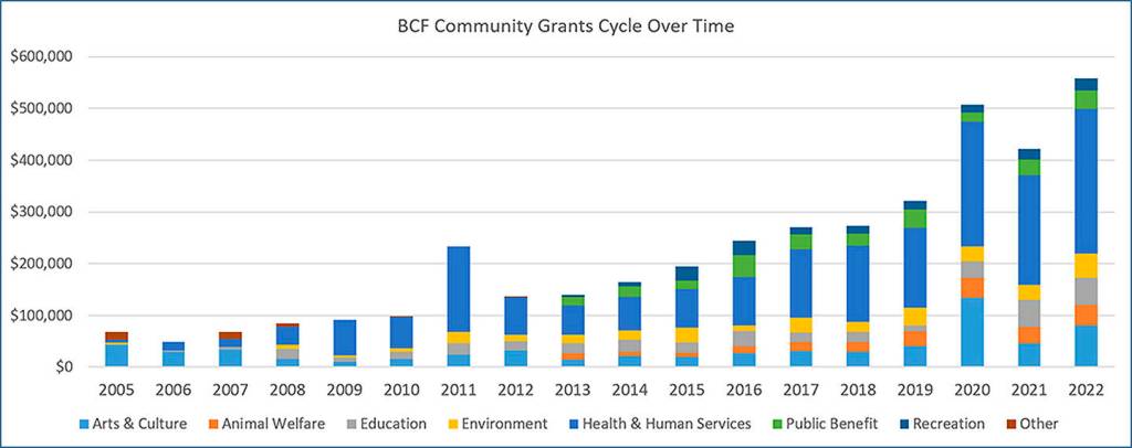 Close to 50% of the grants went toward Health, Housing, and Human Services. BCF has awarded more than $3.9 million through the CGC since the program’s inception in 2005. BCF’s cumulative grantmaking totals more than $20.7 million since 2001.