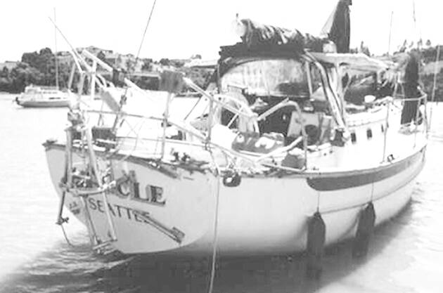 I was dumbfounded when Long Beach Radio responded. We were hundreds of miles from the Long Beach Coast Guard Station. I gave them our position, and explained that we had no steerage. I was finally able to launch the dingy, allowing me to see the rudder jammed up against the starboard side of the hull. It was evident that when the boat dropped back into the water, the force of the impact had snapped the rudder loose from the stock.