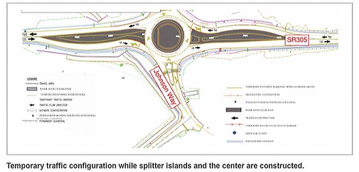 Traffic is shifting to a single-land roundabout with traffic cones and striping. That is because the center and splitter islands are being constructed. Speed limit has been reduced to 25 miles per hour, 20 mph within the roundabout. Be aware of trucks working on the project entering and leaving the area.