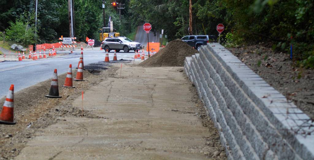 Some nice brickwork serves as a wall next to a wide sidewalk under construction. Steve Powell/Bainbridge Island Review