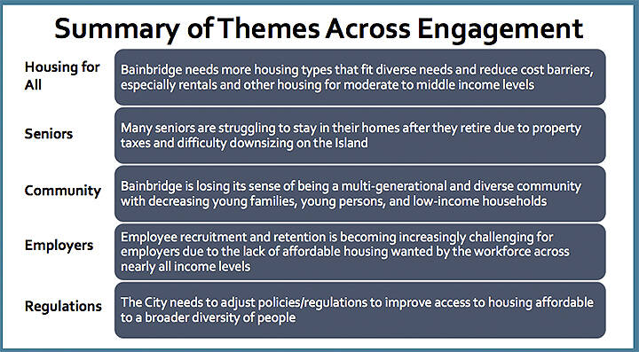 Key themes include: High housing costs, property taxes have displaced or burdened residents; people commute to work as they can’t afford to live here; BI lacks diversity as a result; and seniors can’t afford to live here.