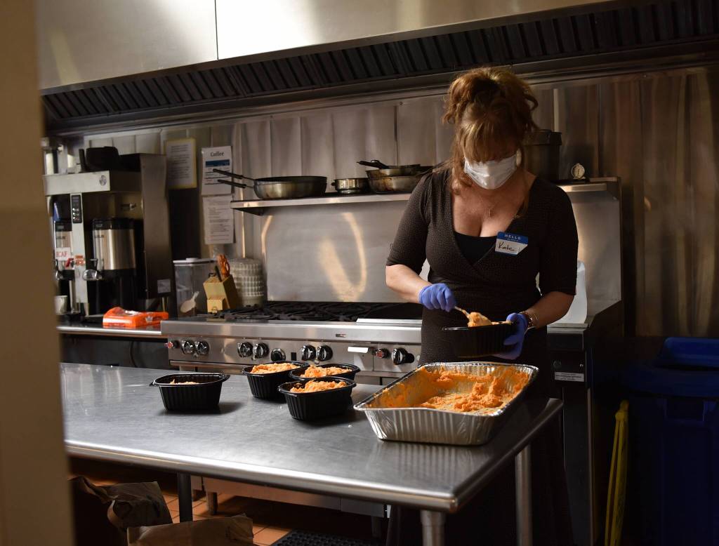 Community volunteers spent Thanksgiving morning at St. Cecilia Catholic Church, packaging meals for delivery to 90 people on Bainbridge Island and setting up a banquet for those unable to have dinner with family.